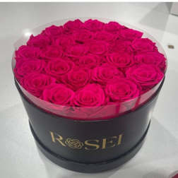 Price: $299.00Luxury Fuchsia Roses in Pink Round Box